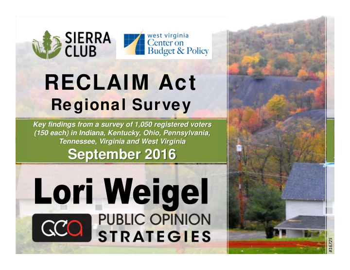 RECLAIM Act Regional Survey Key findings from a survey of 1,050 registered voters (150 each) in Indiana, Kentucky, Ohio, Pennsylvania, Tennessee, Virginia and West Virginia September 2016 #16725