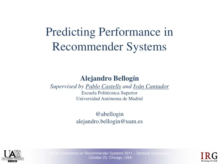 Predicting Performance in Recommender Systems Alejandro Bellogín Supervised by Pablo Castells and Iván Cantador Escuela Politécnica Superior Universidad Autónoma de Madrid @abellogin alejandro.bellogin@uam.es IRG ACM Conference on Recommender Systems 2011 – Doctoral Symposium October 23, Chicago, USA IR Group @ UAM