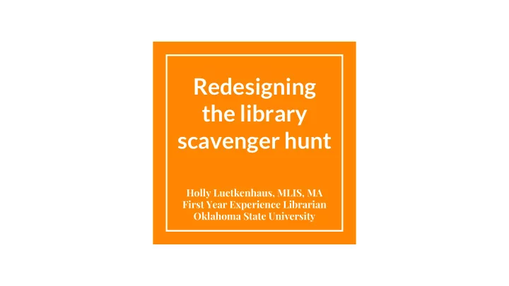 Redesigning the library scavenger hunt Holly Luetkenhaus, MLIS, MA First Year Experience Librarian Oklahoma State University