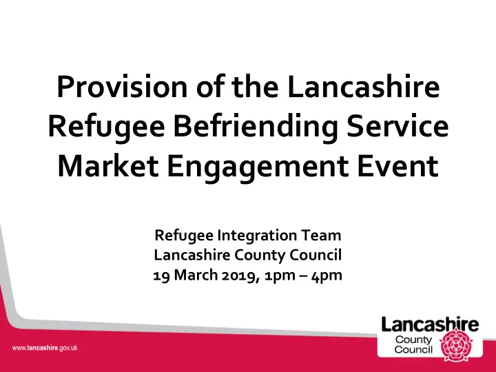 Provision of the Lancashire Refugee Befriending Service Market Engagement Event Refugee Integration Team Lancashire County Council 19 March 2019, 1pm – 4pm