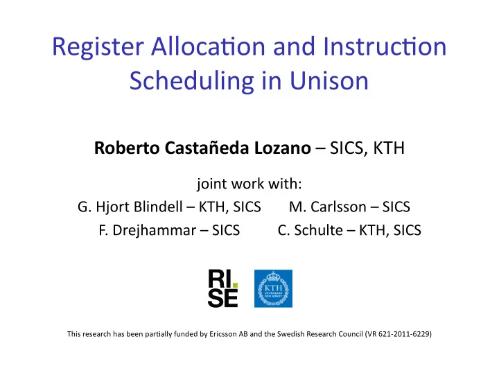 Register Alloca�on and Instruc�on Scheduling in Unison Roberto Castañeda Lozano – SICS, KTH joint work with: G. Hjort Blindell – KTH, SICS M. Carlsson – SICS F. Drejhammar – SICS C. Schulte – KTH, SICS This research has been par�ally funded by Ericsson AB and the Swedish Research Council (VR 621-2011-6229)