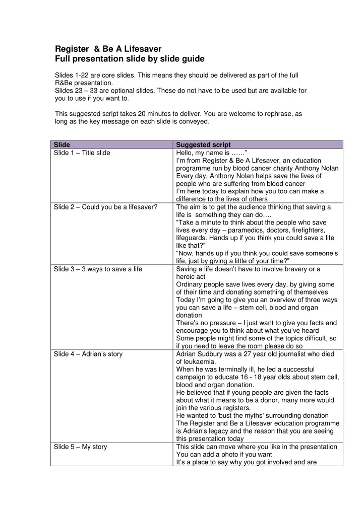 Register & Be A Lifesaver Full presentation slide by slide guide Slides 1-22 are core slides. This means they should be delivered as part of the full R&Be presentation. Slides 23 – 33 are optional slides. These do not have to be used but are available for you to use if you want to. This suggested script takes 20 minutes to deliver. You are welcome to rephrase, as long as the key message on each slide is conveyed. Slide Suggested script Slide 1 – Title slide Hello, my name is ……” I’m from Register & Be A Lifesaver, an education programme run by blood cancer charity Anthony Nolan Every day, Anthony Nolan helps save the lives of people who are suffering from blood cancer I’m here today to explain how you too can make a difference to the lives of others Slide 2 – Could you be a lifesaver? The aim is to get the audience thinking that saving a life is something they can do…. “Take a minu te to think about the people who save lives every day – paramedics, doctors, firefighters, lifeguards. Hands up if you think you could save a life like that?” “Now, hands up if you think you could save someone’s life, just by giving a little of your time?” Slide 3 – 3 ways to save a life Saving a life doesn’t have to involve bravery or a heroic act Ordinary people save lives every day, by giving some of their time and donating something of themselves Today I’m going to give you an overview of three ways you can save a life – stem cell, blood and organ donation There’s no pressure – I just want to give you facts and encourage you to think about what you’ve heard Some people might find some of the topics difficult, so if you need to leave the room please do so Slide 4 – Adrian ’s story Adrian Sudbury was a 27 year old journalist who died of leukaemia. When he was terminally ill, he led a successful campaign to educate 16 - 18 year olds about stem cell, blood and organ donation. He believed that if young people are given the facts about what it means to be a donor, many more would join the various registers. He wanted to 'bust the myths' surrounding donation The Register and Be a Lifesaver education programme is Adrian's legacy and the reason that you are seeing this presentation today Slide 5 – My story This slide can move where you like in the presentation You can add a photo if you want It’s a place to say why you got involved and are