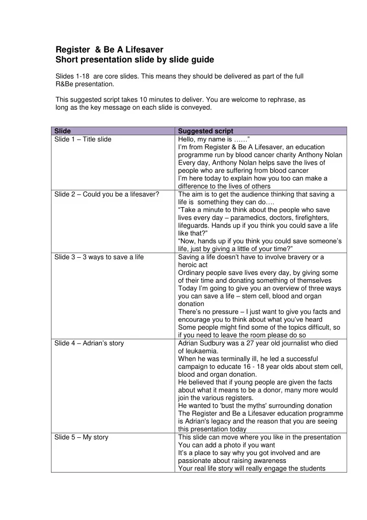Register & Be A Lifesaver Short presentation slide by slide guide Slides 1-18 are core slides. This means they should be delivered as part of the full R&Be presentation. This suggested script takes 10 minutes to deliver. You are welcome to rephrase, as long as the key message on each slide is conveyed. Slide Suggested script Slide 1 – Title slide Hello, my name is ……” I’m from Register & Be A Lifesaver, an education programme run by blood cancer charity Anthony Nolan Every day, Anthony Nolan helps save the lives of people who are suffering from blood cancer I’m here today to explain how you too can make a difference to the lives of others Slide 2 – Could you be a lifesaver? The aim is to get the audience thinking that saving a life is something they can do…. “Take a minute to think about the people who save lives every day – paramedics, doctors, firefighters, lifeguards. Hands up if you think you could save a life like that?” “Now, hands up if you think you could save someone’s life, just by giv ing a little of your time?” Slide 3 – 3 ways to save a life Saving a life doesn’t have to involve bravery or a heroic act Ordinary people save lives every day, by giving some of their time and donating something of themselves Today I’m going to give you a n overview of three ways you can save a life – stem cell, blood and organ donation There’s no pressure – I just want to give you facts and encourage you to think about what you’ve heard Some people might find some of the topics difficult, so if you need to leave the room please do so Slide 4 – Adrian’s story Adrian Sudbury was a 27 year old journalist who died of leukaemia. When he was terminally ill, he led a successful campaign to educate 16 - 18 year olds about stem cell, blood and organ donation. He believed that if young people are given the facts about what it means to be a donor, many more would join the various registers. He wanted to 'bust the myths' surrounding donation The Register and Be a Lifesaver education programme is Adrian's legacy and the reason that you are seeing this presentation today Slide 5 – My story This slide can move where you like in the presentation You can add a photo if you want It’s a place to say why you got involved and are passionate about raising awareness Your real life story will really engage the students