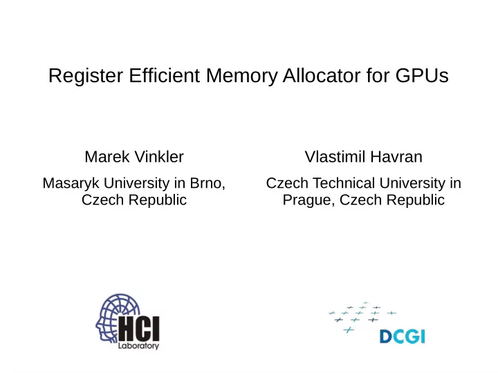 Register Efficient Memory Allocator for GPUs Marek Vinkler Vlastimil Havran Masaryk University in Brno, Czech Technical University in Czech Republic Prague, Czech Republic