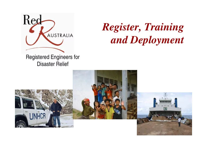 RedR Activities RedR Activities • The Register – Selection of personnel – Maintenance of Register • Training • Deployments • Technical Advice Service • Needs Assessment • Support from members - networking, training, recruitment, fundraising