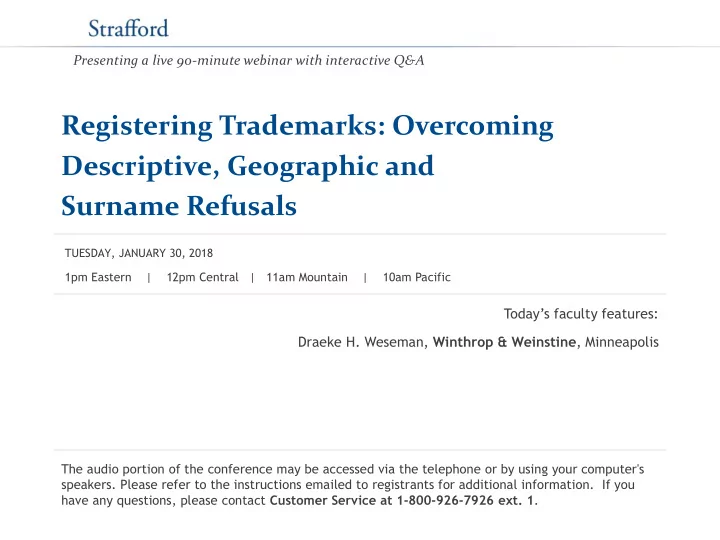 Presenting a live 90-minute webinar with interactive Q&A Registering Trademarks: Overcoming Descriptive, Geographic and Surname Refusals TUESDAY, JANUARY 30, 2018 1pm Eastern | 12pm Central | 11am Mountain | 10am Pacific Today’s faculty features: Draeke H. Weseman, Winthrop & Weinstine , Minneapolis The audio portion of the conference may be accessed via the telephone or by using your computer's speakers. Please refer to the instructions emailed to registrants for additional information. If you have any questions, please contact Customer Service at 1-800-926-7926 ext. 1 .