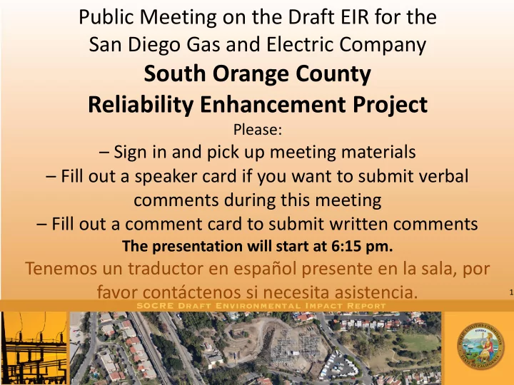 Public Meeting on the Draft EIR for the San Diego Gas and Electric Company South Orange County Reliability Enhancement Project Please: – Sign in and pick up meeting materials – Fill out a speaker card if you want to submit verbal comments during this meeting – Fill out a comment card to submit written comments The presentation will start at 6:15 pm. Tenemos un traductor en español presente en la sala, por favor contáctenos si necesita asistencia. 1