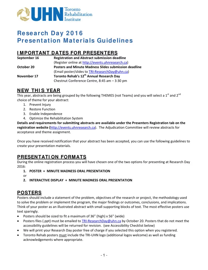 Research Day 2 0 1 6 Presentation Materials Guidelines I MPORTANT DATES FOR PRESENTERS September 16 Registration and Abstract submission deadline (Register online at http://events.uhnresearch.ca) October 20 Posters and Minute Madness Slides submission deadline (Email poster/slides to TRI-ResearchDay@uhn.ca) Toronto Rehab’s 12 th Annual Research Day November 17 Chestnut Conference Centre, 8:45 am – 3:30 pm NEW THI S YEAR This year, abstracts are being grouped by the following THEMES (not Teams) and you will select a 1 st and 2 nd choice of theme for your abstract: 1. Prevent Injury 2. Restore Function 3. Enable Independence 4. Optimize the Rehabilitation System Details and requirements for submitting abstracts are available under the Presenters Registration tab on the registration website ( http://events.uhnresearch.ca). The Adjudication Committee will review abstracts for acceptance and theme assignment. Once you have received notification that your abstract has been accepted, you can use the following guidelines to create your presentation materials. PRESENTATI ON FORMATS During the online registration process you will have chosen one of the two options for presenting at Research Day 2016: 1. POSTER + MINUTE MADNESS ORAL PRESENTATION or 2. INTERACTIVE DISPLAY + MINUTE MADNESS ORAL PRESENTATION POSTERS Posters should include a statement of the problem, objectives of the research or project, the methodology used to solve the problem or implement the program, the major findings or outcomes, conclusions, and implications. Think of your poster as an illustrated abstract with small supporting blocks of text. The most effective posters use text sparingly. • Posters should be sized to fit a maximum of 36” (high) x 56” (wide) • Posters files (.ppt) must be emailed to TRI-ResearchDay@uhn.ca by October 20. Posters that do not meet the accessibility guidelines will be returned for revision. (see Accessibility Checklist below) • We will print your Research Day poster free of charge if you selected this option when you registered. • Toronto Rehab posters must include the TRI-UHN logo (additional logos welcome) as well as funding acknowledgements where appropriate. - 1 -