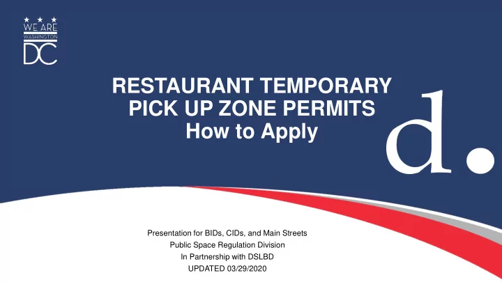RESTAURANT TEMPORARY PICK UP ZONE PERMITS How to Apply Presentation for BIDs, CIDs, and Main Streets Public Space Regulation Division In Partnership with DSLBD UPDATED 03/29/2020