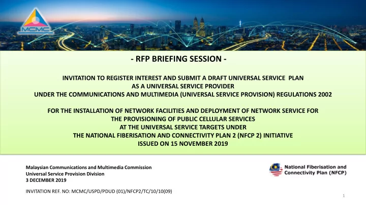 - RFP BRIEFING SESSION - INVITATION TO REGISTER INTEREST AND SUBMIT A DRAFT UNIVERSAL SERVICE PLAN AS A UNIVERSAL SERVICE PROVIDER UNDER THE COMMUNICATIONS AND MULTIMEDIA (UNIVERSAL SERVICE PROVISION) REGULATIONS 2002 FOR THE INSTALLATION OF NETWORK FACILITIES AND DEPLOYMENT OF NETWORK SERVICE FOR THE PROVISIONING OF PUBLIC CELLULAR SERVICES AT THE UNIVERSAL SERVICE TARGETS UNDER THE NATIONAL FIBERISATION AND CONNECTIVITY PLAN 2 (NFCP 2) INITIATIVE ISSUED ON 15 NOVEMBER 2019 Malaysian Communications and Multimedia Commission Universal Service Provision Division 3 DECEMBER 2019 INVITATION REF. NO: MCMC/USPD/PDUD (01)/NFCP2/TC/10/10(09) 1