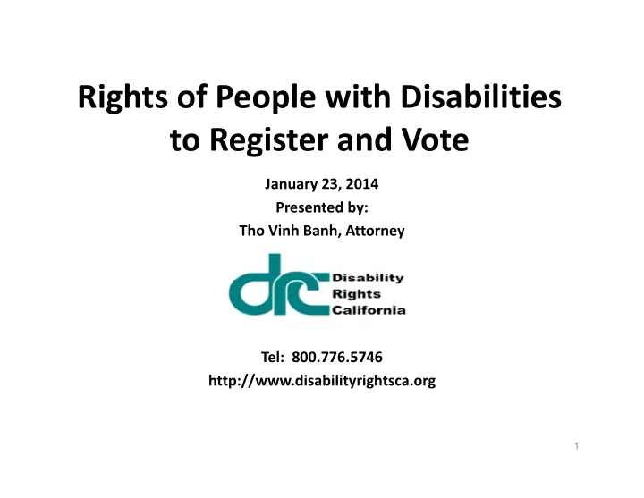 Rights of People with Disabilities Rights of People with Disabilities to Register and Vote g January 23, 2014 Presented by: Tho Vinh Banh, Attorney Tel: 800.776.5746 http://www.disabilityrightsca.org 1