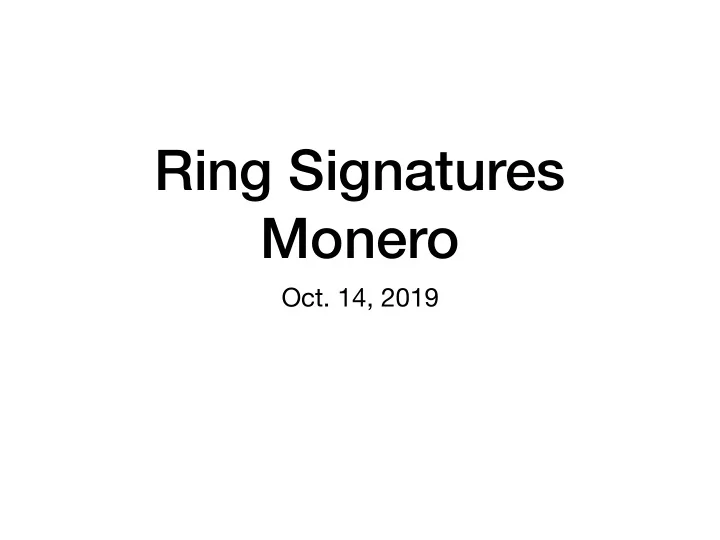 Monero • Anonymously receiving • Address is created from public key • Not possible to link target address to public key • Anonymous sending • Owner selects an anonymity set 𝒯 = { T 1 , T 2 , …, T n } • Shows that one in signed the transaction 𝒯
