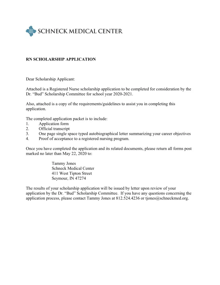 RN SCHOLARSHIP APPLICATION Dear Scholarship Applicant: Attached is a Registered Nurse scholarship application to be completed for consideration by the Dr. “Bud” Scholarship Committee for school year 2020-2021. Also, attached is a copy of the requirements/guidelines to assist you in completing this application. The completed application packet is to include: 1. Application form 2. Official transcript 3. One page single space typed autobiographical letter summarizing your career objectives 4. Proof of acceptance to a registered nursing program. Once you have completed the application and its related documents, please return all forms post marked no later than May 22, 2020 to: Tammy Jones Schneck Medical Center 411 West Tipton Street Seymour, IN 47274 The results of your scholarship application will be issued by letter upon review of your application by the Dr. “Bud” Scholarship Committee. If you have any questions concerning the application process, please contact Tammy Jones at 812.524.4236 or tjones@schneckmed.org.