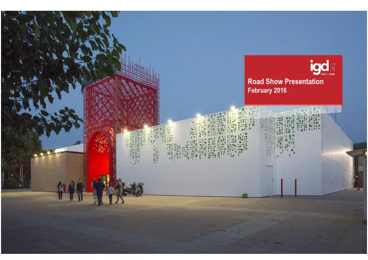 DISCLAIMER This presentation does not constitute an offer or an invitation to subscribe for or purchase any securities. The securities referred to herein have not been registered and will not be registered in the United States under the U.S. Securities Act of 1933, as amended (the “Securities Act”), or in Australia, Canada or Japan or any other jurisdiction where such an offer or solicitatio n would require the approval of local authorities or otherwise be unlawful. The securities may not be offered or sold in the United States or to U.S. persons unless such securities are registered under the Securities Act, or an exemption from the registration requirements of the Securities Act is available. Copies of this presentation are not being made and may not be distributed or sent into the United States, Canada, Australia or Japan. This presentation contains forwards-looking information and statements about IGD SIIQ SPA and its Group. Forward-looking statements are statements that are not historical facts. These statements include financial projections and estimates and their underlying assumptions, statements regarding plans, objectives and expectations with respect to future operations, products and services, and statements regarding plans, performance. Although the management of IGD SIIQ SPA believes that the expectations reflected in such forward-looking statements are reasonable, investors and holders of IGD SIIQ are cautioned that forward-looking information and statements are subject to various risk and uncertainties, many of which are difficult to predict and generally beyond the control of IGD SIIQ; that could cause actual results and developments to differ materially from those expressed in, or implied or projected by, the forward-looking statements. These risks and uncertainties include, but are not limited to, those contained in this presentation. Except as required by applicable law, IGD SIIQ does not undertake any obligation to update any forward-looking information or statements