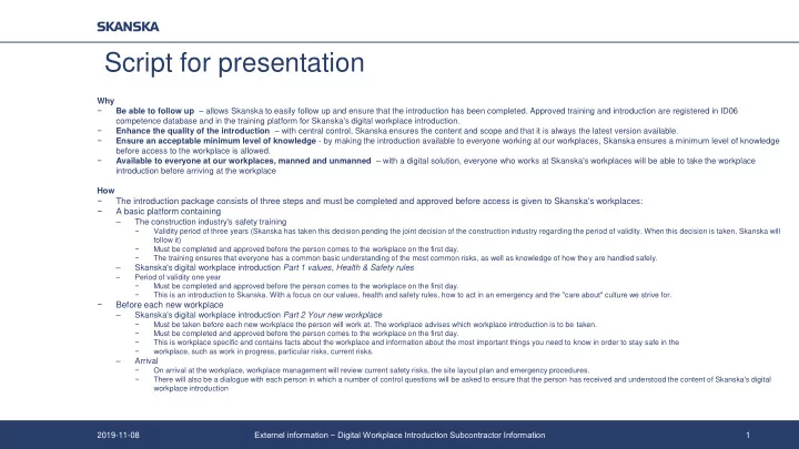 1. Script for presentation Why − Be able to follow up – allows Skanska to easily follow up and ensure that the introduction has been completed. Approved training and introduction are registered in ID06 competence database and in the training platform for Skanska's digital workplace introduction. − Enhance the quality of the introduction – with central control, Skanska ensures the content and scope and that it is always the latest version available. − Ensure an acceptable minimum level of knowledge - by making the introduction available to everyone working at our workplaces, Skanska ensures a minimum level of knowledge before access to the workplace is allowed. − Available to everyone at our workplaces, manned and unmanned – with a digital solution, everyone who works at Skanska's workplaces will be able to take the workplace introduction before arriving at the workplace How − The introduction package consists of three steps and must be completed and approved before access is given to Skanska's workplaces: − A basic platform containing – The construction industry's safety training − Validity period of three years (Skanska has taken this decision pending the joint decision of the construction industry regarding the period of validity. When this decision is taken, Skanska will follow it) − Must be completed and approved before the person comes to the workplace on the first day. − The training ensures that everyone has a common basic understanding of the most common risks, as well as knowledge of how they are handled safely. – Skanska's digital workplace introduction Part 1 values, Health & Safety rules – Period of validity one year − Must be completed and approved before the person comes to the workplace on the first day. − This is an introduction to Skanska. With a focus on our values, health and safety rules, how to act in an emergency and the "care about" culture we strive for. − Before each new workplace – Skanska's digital workplace introduction Part 2 Your new workplace − Must be taken before each new workplace the person will work at. The workplace advises which workplace introduction is to be taken. − Must be completed and approved before the person comes to the workplace on the first day. − This is workplace specific and contains facts about the workplace and information about the most important things you need to know in order to stay safe in the − workplace, such as work in progress, particular risks, current risks. – Arrival − On arrival at the workplace, workplace management will review current safety risks, the site layout plan and emergency procedures. − There will also be a dialogue with each person in which a number of control questions will be asked to ensure that the person has received and understood the content of Skanska's digital workplace introduction Externel information − Digital Workplace Introduction Subcontractor Information 2019-11-08 1