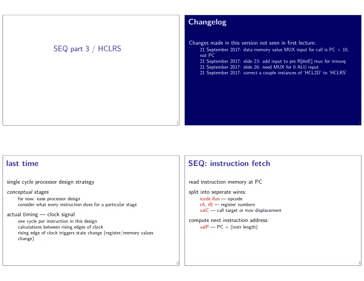 SEQ part 3 / HCLRS one cycle per instruction in this design valP — PC + (instr length) compute next instruction address: valC — call target or mov displacement rA, rB — register numbers icode:ifun — opcode split into seperate wires: read instruction memory at PC SEQ: instruction fetch 2 change) rising edge of clock triggers state change (register/memory values calculations between rising edges of clock actual timing — clock signal 1 consider what every instruction does for a particular stage for now: ease processor design conceptual stages single cycle processor design strategy last time 1 21 September 2017: correct a couple instances of ‘HCL2D’ to ‘HCLRS’ 21 September 2017: slide 26: need MUX for 0 ALU input 21 September 2017: slide 23: add input to pre R[dstE] mux for irmovq not PC 21 September 2017: data memory value MUX input for call is PC + 10, Changes made in this version not seen in fjrst lecture: Changelog 3