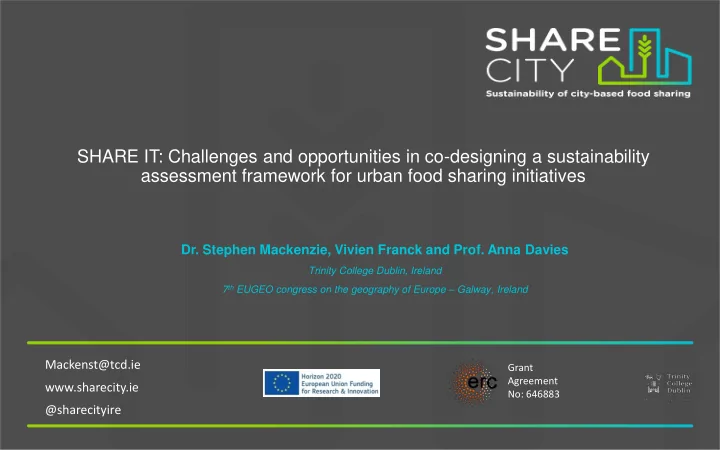 SHARE IT: Challenges and opportunities in co-designing a sustainability assessment framework for urban food sharing initiatives Dr. Stephen Mackenzie, Vivien Franck and Prof. Anna Davies Trinity College Dublin, Ireland 7 th EUGEO congress on the geography of Europe – Galway, Ireland Mackenst@tcd.ie Grant Agreement www.sharecity.ie No: 646883 @sharecityire