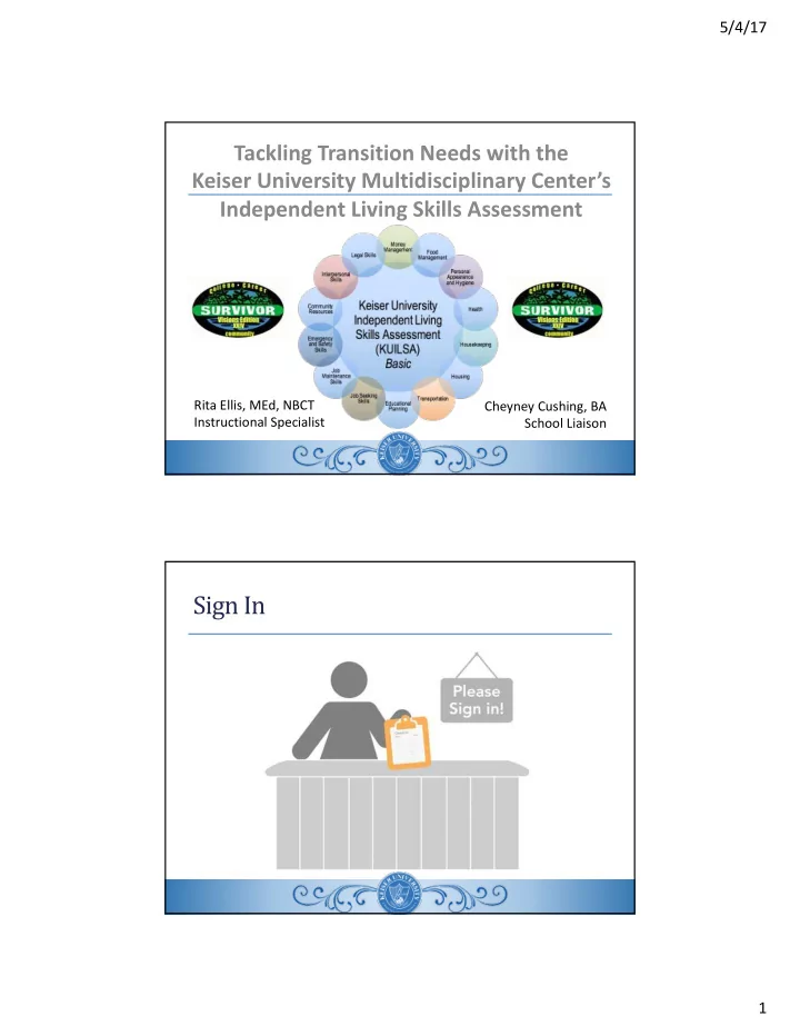 5/4/17 Tackling Transition Needs with the Keiser University Multidisciplinary Center’s Independent Living Skills Assessment Rita Ellis, MEd, NBCT Cheyney Cushing, BA Instructional Specialist School Liaison Sign In 1