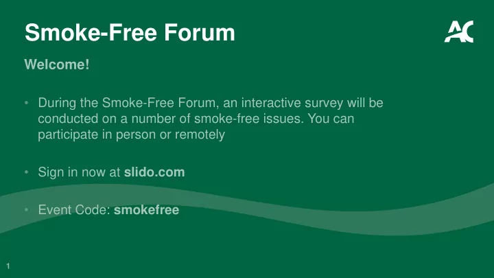 Smoke-Free Forum Welcome! • During the Smoke-Free Forum, an interactive survey will be conducted on a number of smoke-free issues. You can participate in person or remotely • Sign in now at slido.com • Event Code: smokefree 1