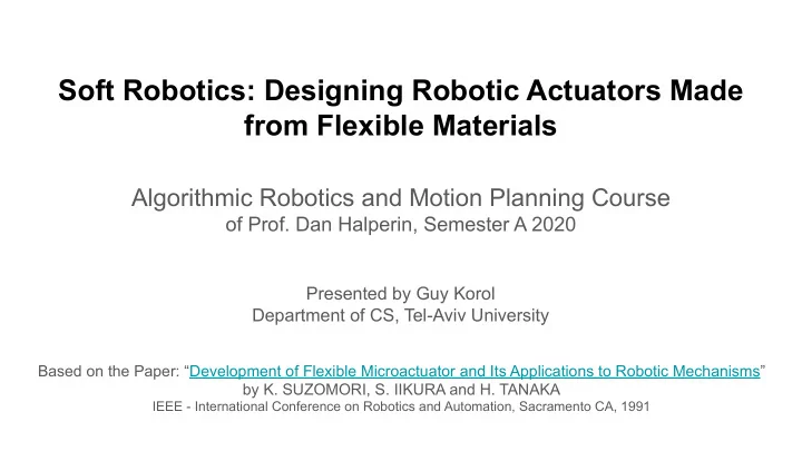 Soft Robotics: Designing Robotic Actuators Made from Flexible Materials Algorithmic Robotics and Motion Planning Course of Prof. Dan Halperin, Semester A 2020 Presented by Guy Korol Department of CS, Tel-Aviv University Based on the Paper: “Development of Flexible Microactuator and Its Applications to Robotic Mechanisms” by K. SUZOMORI, S. IIKURA and H. TANAKA IEEE - International Conference on Robotics and Automation, Sacramento CA, 1991