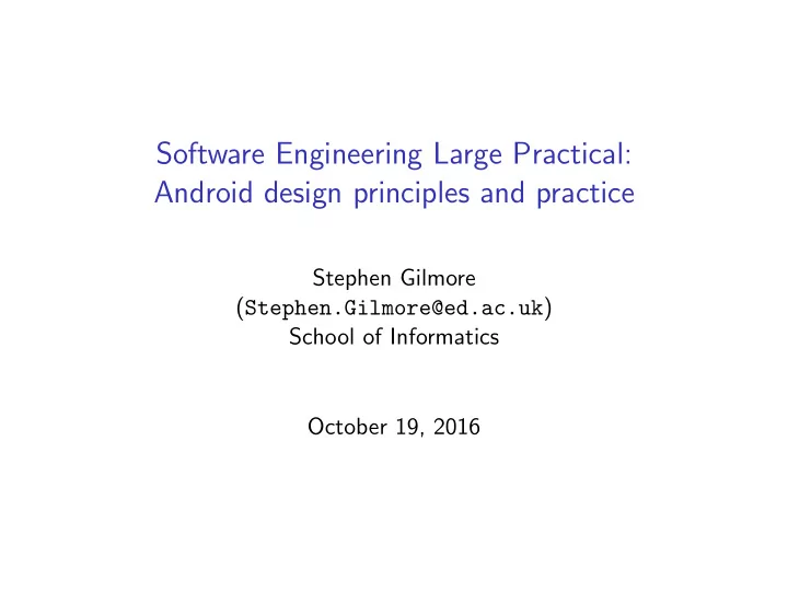 Software Engineering Large Practical: Android design principles and practice Stephen Gilmore ( Stephen.Gilmore@ed.ac.uk ) School of Informatics October 19, 2016