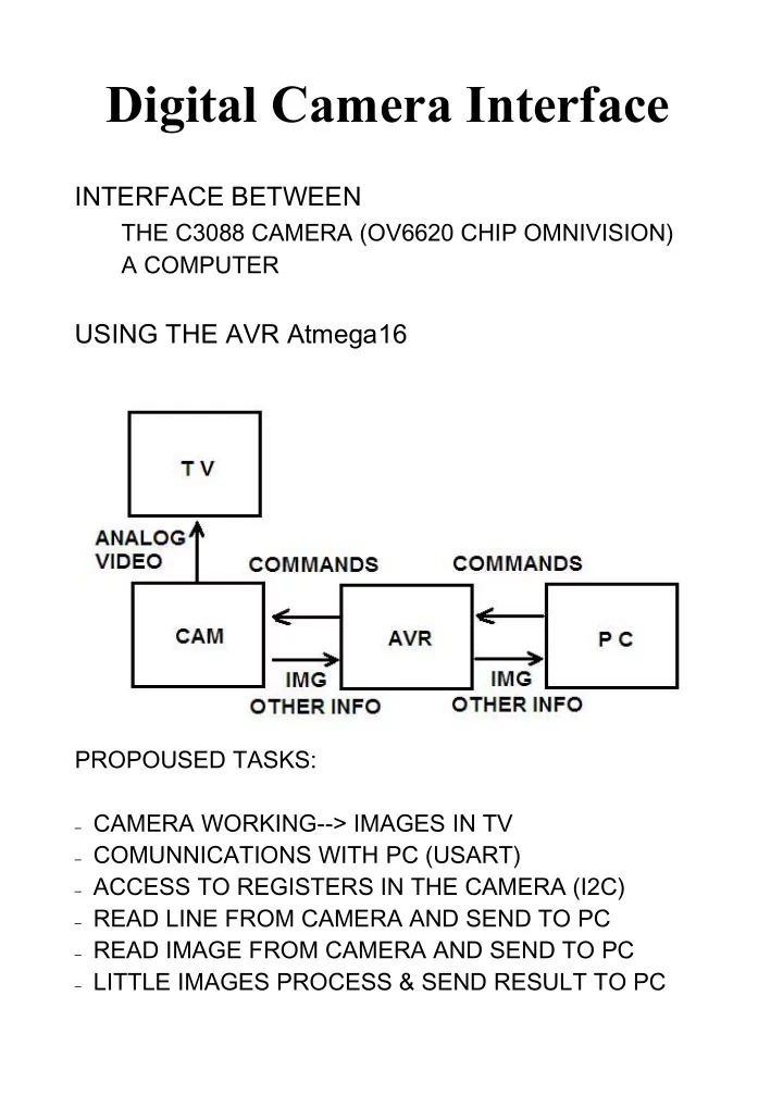 Digital Camera Interface INTERFACE BETWEEN THE C3088 CAMERA (OV6620 CHIP OMNIVISION) A COMPUTER USING THE AVR Atmega16 PROPOUSED TASKS: – CAMERA WORKING--> IMAGES IN TV – COMUNNICATIONS WITH PC (USART) – ACCESS TO REGISTERS IN THE CAMERA (I2C) – READ LINE FROM CAMERA AND SEND TO PC – READ IMAGE FROM CAMERA AND SEND TO PC – LITTLE IMAGES PROCESS & SEND RESULT TO PC
