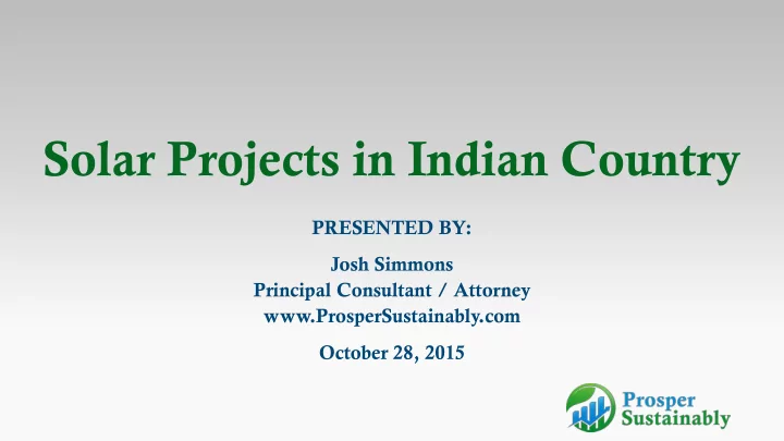 Solar Projects in Indian Country PRESENTED BY: Josh Simmons Principal Consultant / Attorney www.ProsperSustainably.com October 28, 2015