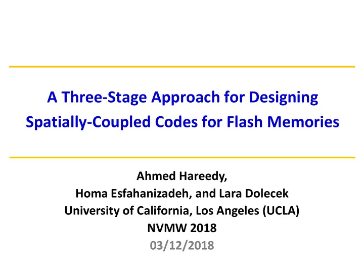 A Three-Stage Approach for Designing Spatially-Coupled Codes for Flash Memories Ahmed Hareedy, Homa Esfahanizadeh, and Lara Dolecek University of California, Los Angeles (UCLA) NVMW 2018 03/12/2018