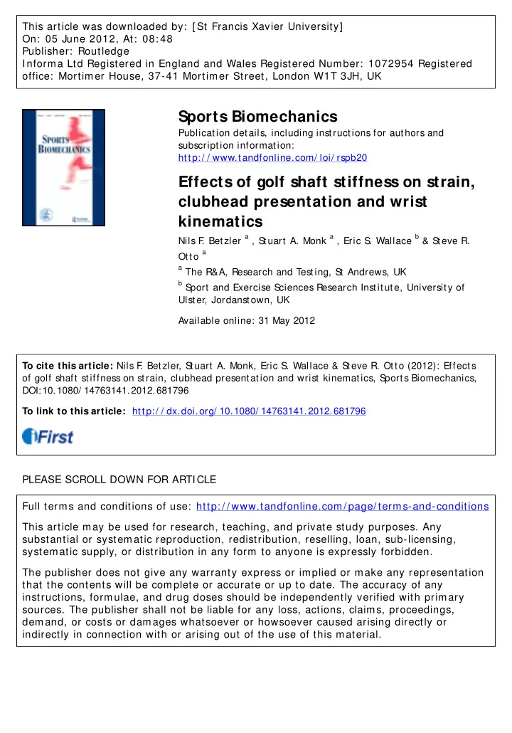 This article was downloaded by: [ St Francis Xavier University] On: 05 June 2012, At: 08: 48 Publisher: Routledge Informa Ltd Registered in England and Wales Registered Number: 1072954 Registered office: Mortimer House, 37-41 Mortimer Street, London W1T 3JH, UK Sports Biomechanics Publication details, including instructions for authors and subscription information: http:/ / www.tandfonline.com/ loi/ rspb20 Effects of golf shaft stiffness on strain, clubhead presentation and wrist kinematics a , S a , Eric S b & S Nils F . Betzler tuart A. Monk . Wallace teve R. a Otto a The R&A, Research and Testing, S t Andrews, UK b S port and Exercise S ciences Research Institute, University of Ulster, Jordanstown, UK Available online: 31 May 2012 To cite this article: Nils F . Betzler, S tuart A. Monk, Eric S . Wallace & S teve R. Otto (2012): Effects of golf shaft stiffness on strain, clubhead presentation and wrist kinematics, S ports Biomechanics, DOI:10.1080/ 14763141.2012.681796 To link to this article: http:/ / dx.doi.org/ 10.1080/ 14763141.2012.681796 PLEASE SCROLL DOWN FOR ARTICLE Full terms and conditions of use: http: / / www.tandfonline.com/ page/ terms-and-conditions This article may be used for research, teaching, and private study purposes. Any substantial or systematic reproduction, redistribution, reselling, loan, sub-licensing, systematic supply, or distribution in any form to anyone is expressly forbidden. The publisher does not give any warranty express or implied or make any representation that the contents will be complete or accurate or up to date. The accuracy of any instructions, formulae, and drug doses should be independently verified with primary sources. The publisher shall not be liable for any loss, actions, claims, proceedings, demand, or costs or damages whatsoever or howsoever caused arising directly or indirectly in connection with or arising out of the use of this material.