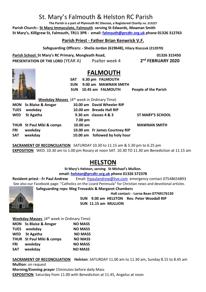 St. Mary’s Falmouth & Helston RC Parish The Parish is a part of Plymouth RC Diocese, a Registered Charity no. 213227 Parish Church:- St Mary Immaculate, Falmouth serving St Edwards, Mawnan Smith St Mary’s, Killigrew St, Falmouth, TR11 3PR - email: falmouth@prcdtr.org.uk phone 01326 312763 Parish Priest - Father Brian Kenwrick V.F. Safeguarding Officers: - Sheila Jordan (619648), Hilary Kiszczuk (212070) Parish School: St Mary’s RC Primary, Mongleath Road, 01326 315450 PRESENTATION OF THE LORD (YEAR A) Psalter week 4 2 nd FEBRUARY 2020 FALMOUTH SAT 6.30 pm FALMOUTH SUN 9.00 am MAWNAN SMITH SUN 10.45 am FALMOUTH People of the Parish Weekday Masses (4 th week in Ordinary Time) MON Ss Blaise & Ansgar 10.00 am David Wheeler RIP TUES weekday 10.00 am Breada Hall RIP WED St Agatha 9.30 am classes 4 & 3 ST MARY ’ S SCHOOL 7.00 pm THUR St Paul Miki & comps 10.00 am MAWNAN SMITH FRI weekday 10.00 am Fr James Courtney RIP SAT weekday 10.00 am followed by holy hour SACRAMENT OF RECONCILIATION SATURDAY 10.30 to 11.15 am & 5.30 pm to 6.25 pm EXPOSITION WED. 10.30 am to 1.00 pm Rosary at noon SAT. 10.30 TO 11.30 am Benediction at 11.15 am HELSTON St Mary’s Helston, serving St Michael’s Mullion. email: helston@prcdtr.org.uk phone 01326 572378 Resident priest - Fr Paul Andrew Email: frpaulandrew@live.com emergency contact 07548654893 See also our Facebook page: "Catholics on the Lizard Peninsula" for Christian news and devotional articles . Safeguarding reps: Meg Trevaskis & Margaret Chambers Hall contact: - Lorna Bean 07769176130 SUN 9.00 am HELSTON Rev. Peter Woodall RIP SUN 11.15 am MULLION Weekday Masses (4 th week in Ordinary Time) MON Ss Blaise & Ansgar NO MASS TUES weekday NO MASS WED St Agatha NO MASS THUR St Paul Miki & comps NO MASS FRI weekday NO MASS SAT weekday NO MASS SACRAMENT OF RECONCILIATION Helston : SATURDAY 11.00 am to 11.30 am, Sunday 8.15 to 8.45 am Mullion : on request Morning/Evening prayer 15minutes before daily Mass EXPOSITION Saturday from 11.00 with Benediction at 11.45, Angelus at noon