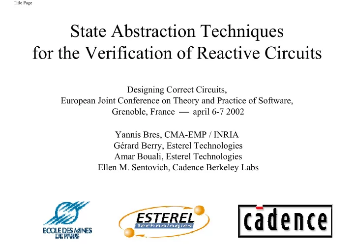 Title Page State Abstraction Techniques for the Verification of Reactive Circuits Designing Correct Circuits, European Joint Conference on Theory and Practice of Software, Grenoble, France april 6-7 2002 Yannis Bres, CMA-EMP / INRIA Gérard Berry, Esterel Technologies Amar Bouali, Esterel Technologies Ellen M. Sentovich, Cadence Berkeley Labs