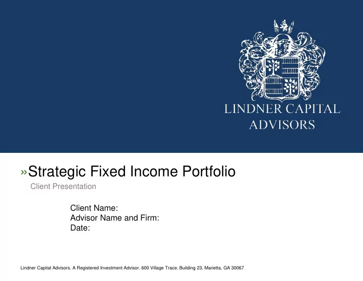 »Strategic Fixed Income Portfolio Client Presentation Client Name: Advisor Name and Firm: Date: Lindner Capital Advisors. A Registered Investment Advisor. 600 Village Trace, Building 23, Marietta, GA 30067