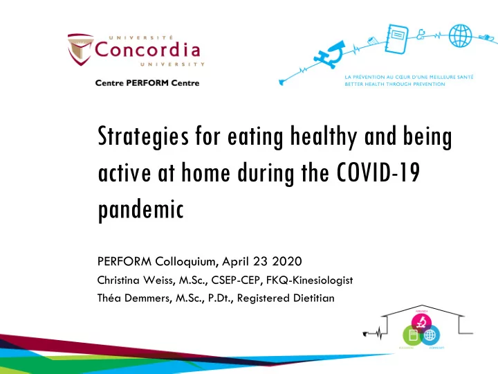 Strategies for eating healthy and being active at home during the COVID-19 pandemic PERFORM Colloquium, April 23 2020 Christina Weiss, M.Sc., CSEP-CEP, FKQ-Kinesiologist Théa Demmers, M.Sc., P.Dt., Registered Dietitian