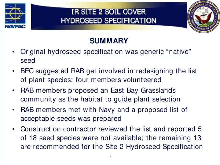 IR SITE 2 SOIL COVER HYDROSEED SPECIFICATION SUMMARY • Original hydroseed specification was generic “native” seed • BEC suggested RAB get involved in redesigning the list of plant species; four members volunteered • RAB members proposed an East Bay Grasslands community as the habitat to guide plant selection • RAB members met with Navy and a proposed list of acceptable seeds was prepared • Construction contractor reviewed the list and reported 5 of 18 seed species were not available; the remaining 13 are recommended for the Site 2 Hydroseed Specification 1