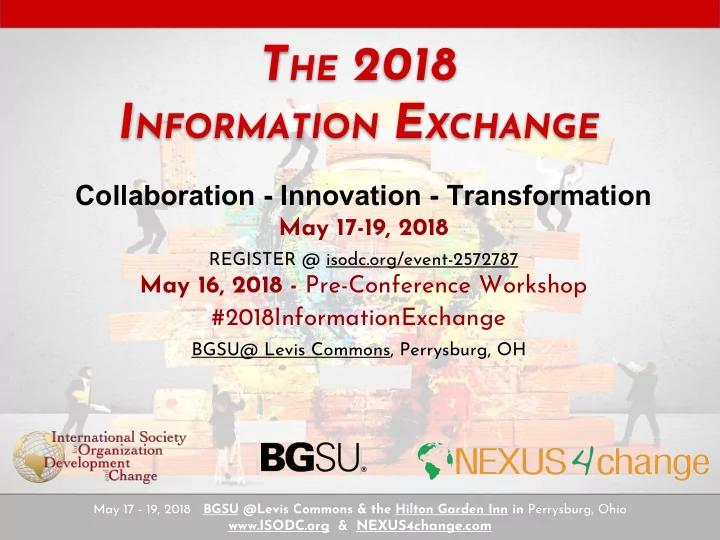 T HE 2018 I NFORMATION E XCHANGE Collaboration - Innovation - Transformation May 17-19, 2018 REGISTER @ isodc.org/event-2572787 May 16, 2018 - Pre-Conference Workshop #2018InformationExchange BGSU@ Levis Commons, Perrysburg, OH May 17 - 19, 2018 BGSU @Levis Commons & the Hilton Garden Inn in Perrysburg, Ohio www.ISODC.org & NEXUS4change.com