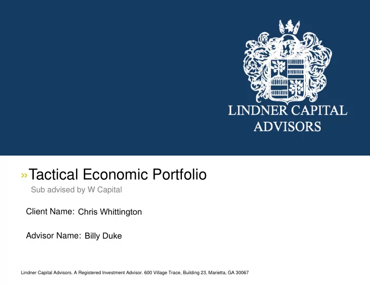 »Tactical Economic Portfolio Sub advised by W Capital Chris Whittington Client Name: Billy Duke Advisor Name: Lindner Capital Advisors. A Registered Investment Advisor. 600 Village Trace, Building 23, Marietta, GA 30067