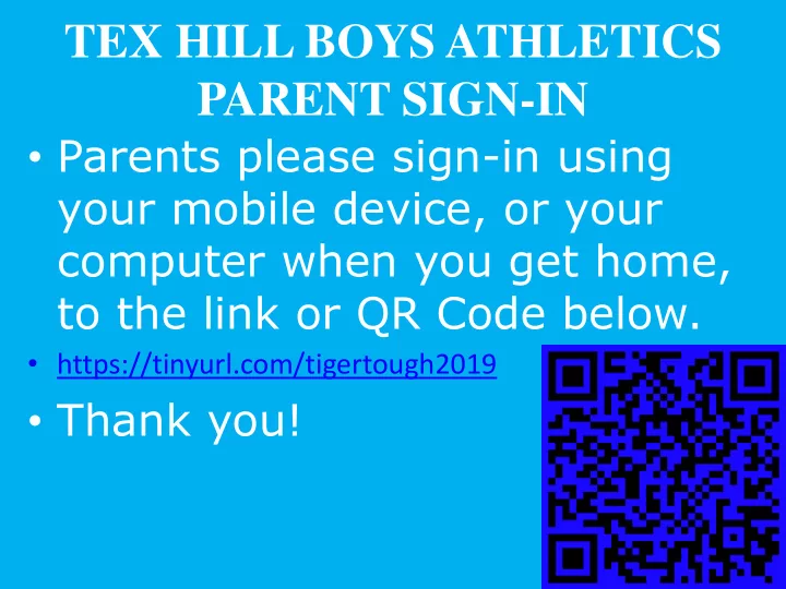 TEX HILL BOYS ATHLETICS PARENT SIGN-IN • Parents please sign-in using your mobile device, or your computer when you get home, to the link or QR Code below. • https://tinyurl.com/tigertough2019 • Thank you!