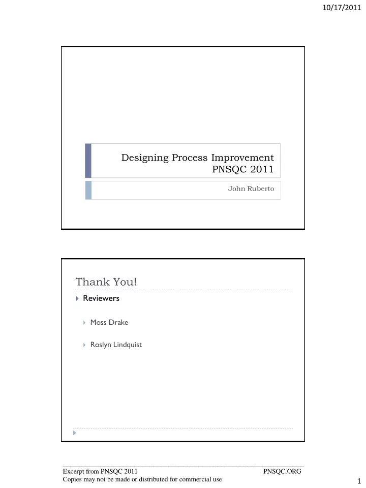 10/17/2011 Designing Process Improvement PNSQC 2011 John Ruberto Thank You! Reviewers Moss Drake Roslyn Lindquist ________________________________________________________________ Excerpt from PNSQC 2011 PNSQC.ORG Copies may not be made or distributed for commercial use 1