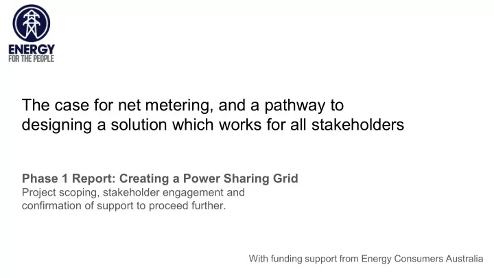 The case for net metering, and a pathway to designing a solution which works for all stakeholders Phase 1 Report: Creating a Power Sharing Grid Project scoping, stakeholder engagement and confirmation of support to proceed further. With funding support from Energy Consumers Australia