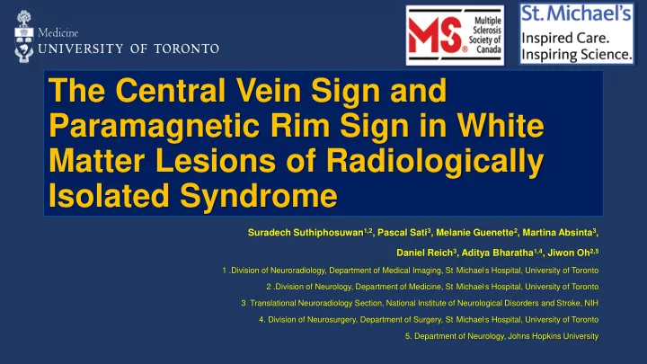 The Central Vein Sign and Paramagnetic Rim Sign in White Matter Lesions of Radiologically Isolated Syndrome Suradech Suthiphosuwan 1,2 , Pascal Sati 3 , Melanie Guenette 2 , Martina Absinta 3 , Daniel Reich 3 , Aditya Bharatha 1,4 , Jiwon Oh 2,5 1 .Division of Neuroradiology, Department of Medical Imaging, St . Michael ’ s Hospital, University of Toronto 2 .Division of Neurology, Department of Medicine, St . Michael ’ s Hospital, University of Toronto 3 . Translational Neuroradiology Section, National Institute of Neurological Disorders and Stroke, NIH 4. Division of Neurosurgery, Department of Surgery, St . Michael ’ s Hospital, University of Toronto 5. Department of Neurology, Johns Hopkins University