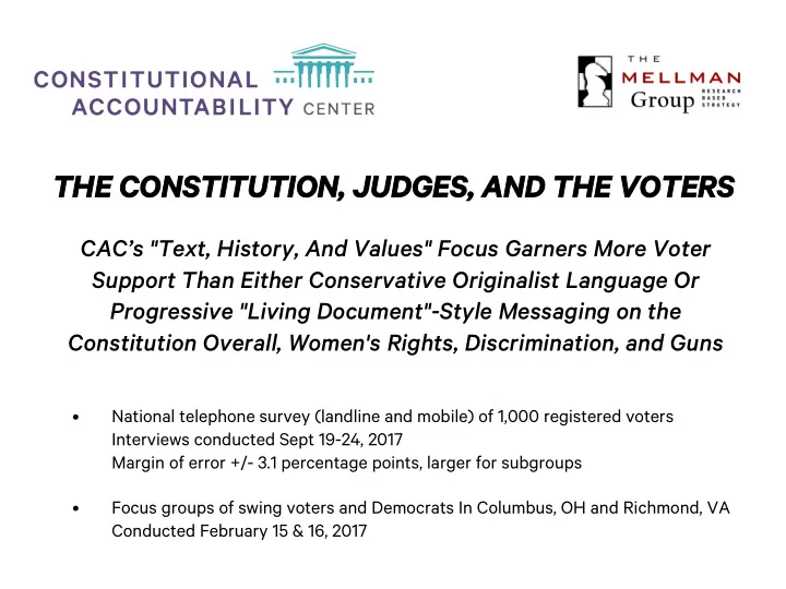 • National telephone survey (landline and mobile) of 1,000 registered voters Interviews conducted Sept 19-24, 2017 Margin of error +/- 3.1 percentage points, larger for subgroups • Focus groups of swing voters and Democrats In Columbus, OH and Richmond, VA Conducted February 15 & 16, 2017 THE CONSTITUTION, JUDGES, AND THE VOTERS CAC’s "Text, History, And Values" Focus Garners More Voter Support Than Either Conservative Originalist Language Or Progressive "Living Document"-Style Messaging on the Constitution Overall, Women's Rights, Discrimination, and Guns