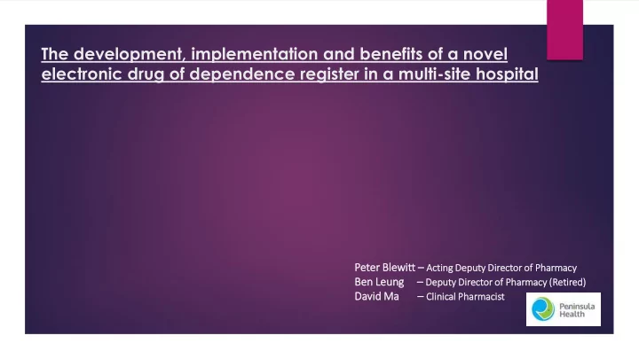 The development, implementation and benefits of a novel electronic drug of dependence register in a multi-site hospital Peter Bl Blewitt t – Ac Actin ing De Deputy Di Director or of of Pha harmacy Ben Ben Leu Leung – De Deputy Di Director or of of Pharmacy (Retir tired) Da David id Ma Ma – Cli Clinical Pha Pharmacist