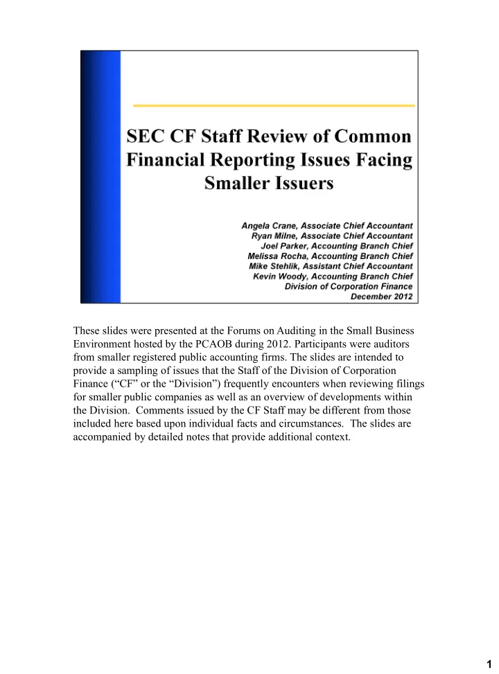 These slides were presented at the Forums on Auditing in the Small Business Environment hosted by the PCAOB during 2012. Participants were auditors from smaller registered public accounting firms. The slides are intended to provide a sampling of issues that the Staff of the Division of Corporation Finance (“CF” or the “Division”) frequently encounters when reviewing filings for smaller public companies as well as an overview of developments within the Division. Comments issued by the CF Staff may be different from those included here based upon individual facts and circumstances. The slides are accompanied by detailed notes that provide additional context. 1