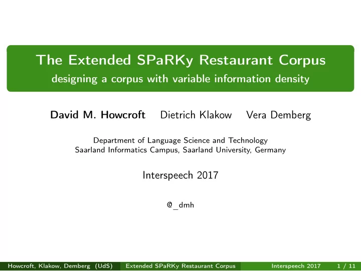 The Extended SPaRKy Restaurant Corpus designing a corpus with variable information density David M. Howcroft Dietrich Klakow Vera Demberg Department of Language Science and Technology Saarland Informatics Campus, Saarland University, Germany Interspeech 2017 @_dmh Howcroft, Klakow, Demberg (UdS) Extended SPaRKy Restaurant Corpus Interspeech 2017 1 / 11
