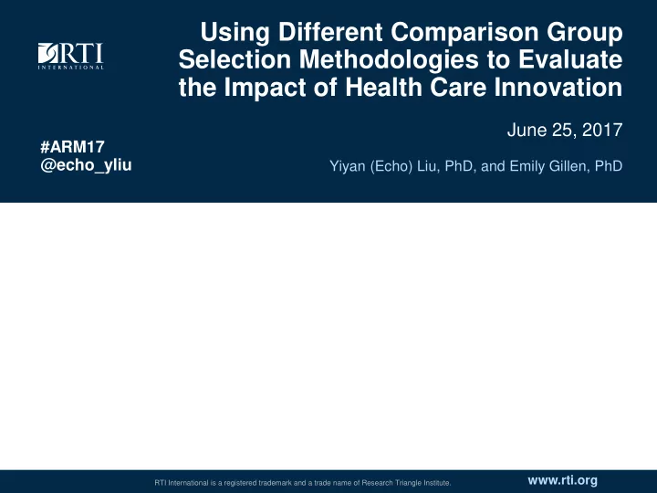 Using Different Comparison Group Selection Methodologies to Evaluate the Impact of Health Care Innovation June 25, 2017 #ARM17 @echo_yliu Yiyan (Echo) Liu, PhD, and Emily Gillen, PhD www.rti.org RTI International is a registered trademark and a trade name of Research Triangle Institute.