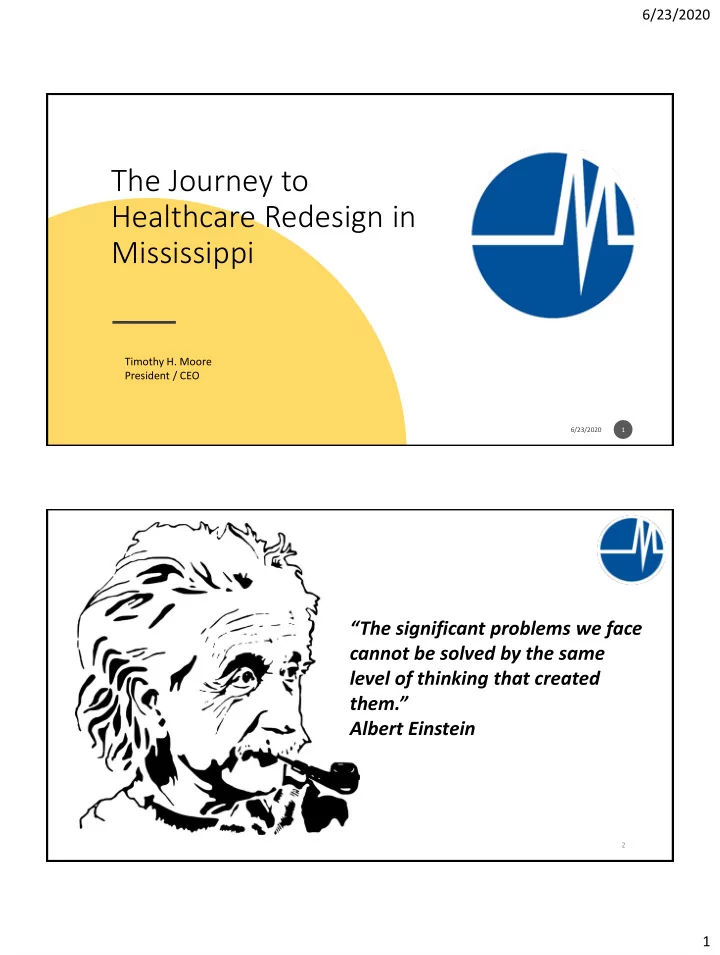 6/23/2020 The Journey to Healthcare Redesign in Mississippi Timothy H. Moore President / CEO 6/23/2020 1 “The significant problems we face cannot be solved by the same level of thinking that created them.” Albert Einstein 2 1
