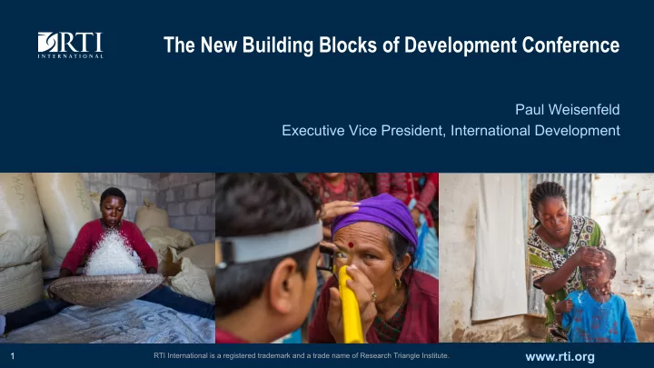 The New Building Blocks of Development Conference Paul Weisenfeld Executive Vice President, International Development www.rti.org 1 RTI International is a registered trademark and a trade name of Research Triangle Institute.