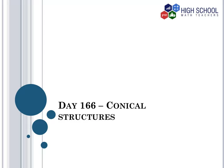 I NTRODUCTION Quite a number of structures made in the form of a cone. These include tents, conical ice cream scoop, and some roofs. When designing these structures, one may want it to have the maximum volume with the available size of the material. One may also want a conical structure with a given volume to have the minimum surface area to minimize the cost of the material. In this lesson, we will apply geometric methods to solve design problems of the conical structures or objects to satisfy physical constraints or minimize cost.