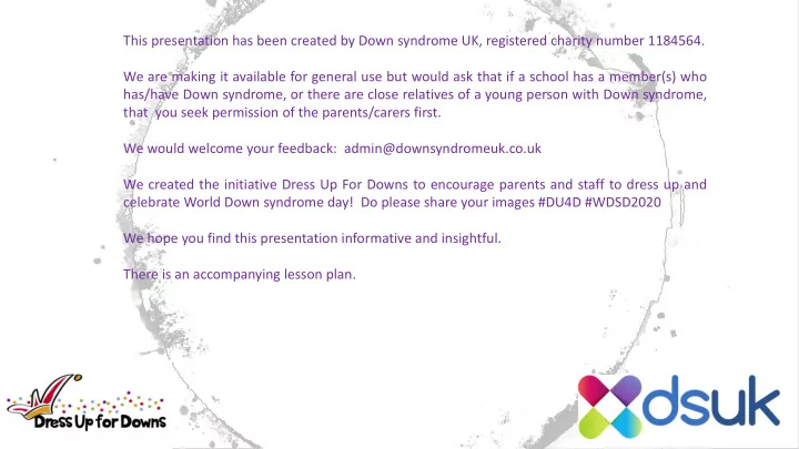 This presentation has been created by Down syndrome UK, registered charity number 1184564. We are making it available for general use but would ask that if a school has a member(s) who has/have Down syndrome, or there are close relatives of a young person with Down syndrome, that you seek permission of the parents/carers first. We would welcome your feedback: admin@downsyndromeuk.co.uk We created the initiative Dress Up For Downs to encourage parents and staff to dress up and celebrate World Down syndrome day! Do please share your images #DU4D #WDSD2020 We hope you find this presentation informative and insightful. There is an accompanying lesson plan.