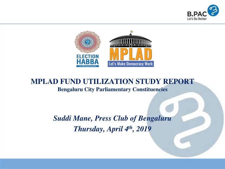 MPLAD FUND UTILIZATION STUDY REPORT Bengaluru City Parliamentary Constituencies Suddi Mane, Press Club of Bengaluru Thursday, April 4 th , 2019